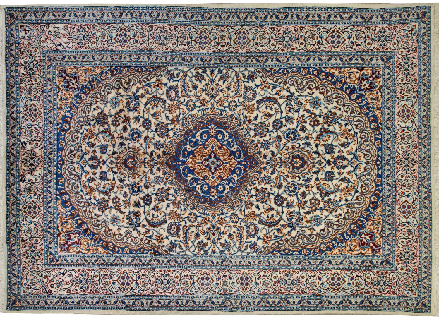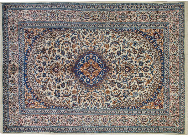 Persien. Wolle mit Seide auf Baumwolle. Im elfenbeinfarbenen Innenfeld zentrales Rundmedaillon mit Anhängern sowie korrespondierende Ecklösungen. Flächendeckend dichte Musterung aus Palmettenranken. Umlaufend breite, entsprechende Bordüre, flankiert von schmalen Borten. 240 cm x 330 cm.