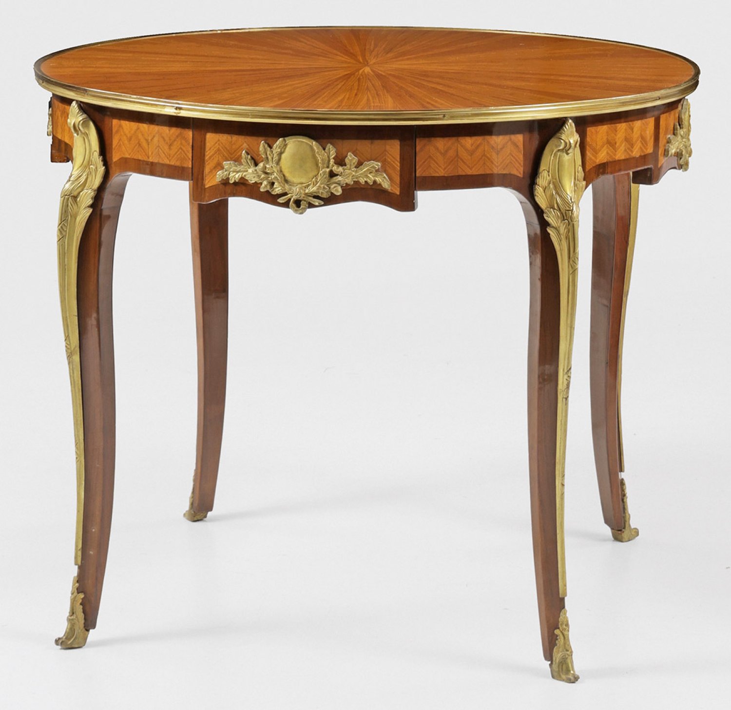 Palisander und Rosenholz, furniert. Bombierte Zarge mit flachen Mittelrisaliten auf leicht geschweiften, konischen Beinen als Träger für runde, profilgerahmte Deckplatte mit zentriert angeordneten Furnierfeldern. Applikationen aus Bronze. H. 80,5 cm. D. 101 cm.