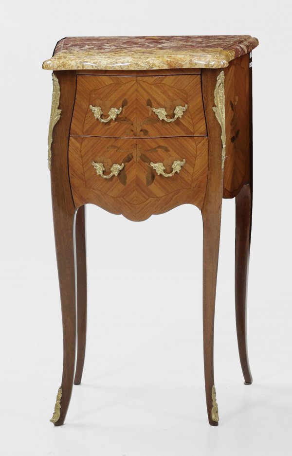 Mahagoni und Rosenholz, massiv und furniert. Dreiseitig bombierter Korpus auf hohen, ausgestellten Beinen. In der gegliederten Front zwei Schubladen sans traverse. Gespiegelt angeordnete Furnierfelder mit intarsierten Blüten. Profilgerahmte Deckpatte aus cremefarben und violett gemasertem Marmor. Schlagstempel "MARQUANI". H. 76 cm. 44 cm x 31,5 cm.