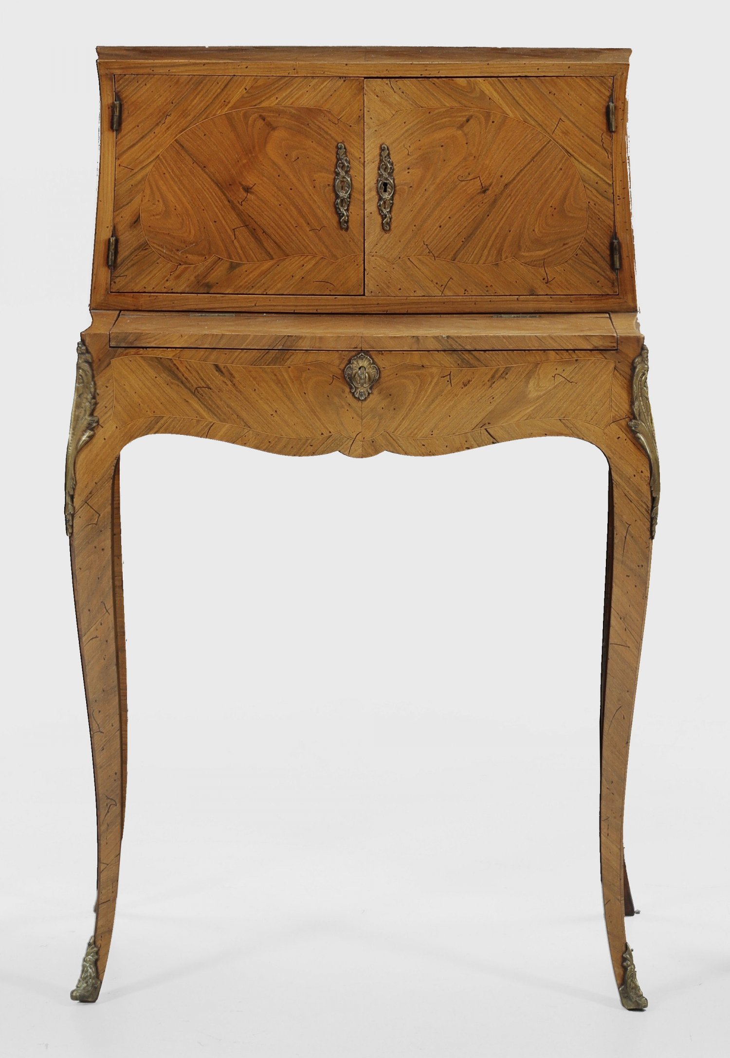 Nussbaum, furniert. Leicht bombierter Korpus auf hohen, geschwungenen Beinen. In der Front aufklappbare Lade sowie zwei zurückgesetzte Türen. Dahinter gestaffelte Facheinteilung. Flächendeckend breit gerahmte Furnierfelder, von Fadeneinlagen begrenzt. H. 100 cm. 64 cm x 36 cm.
