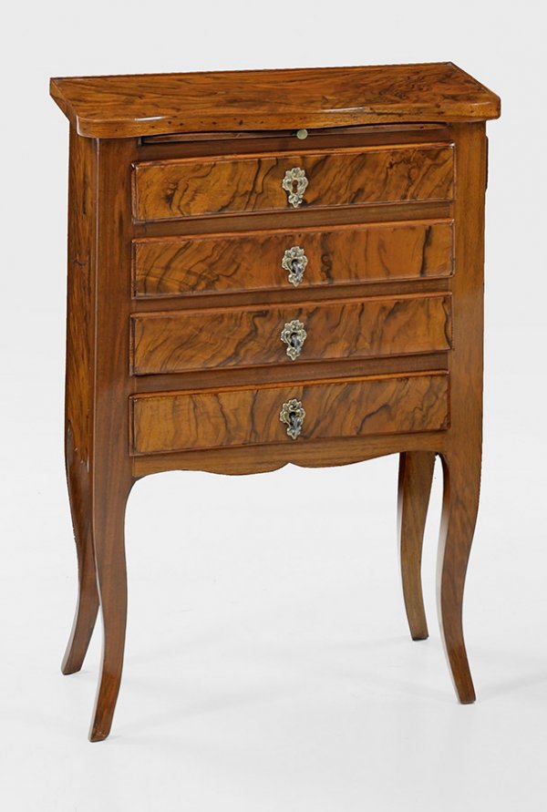 Nussbaum, furniert. Gerader, rechteckiger Korpus auf geschweiften Beinen. In der Front ausziehbare Abstellfläche sowie drei Schubladen und eine Blendschublade. Seitlich korrespondierendes Schubfach. Schauseitig geschweifte Deckplatte. Rest. mit Erg.; H. 67,5 cm. 47,5 cm x 29 cm.
