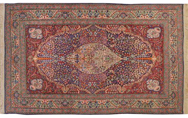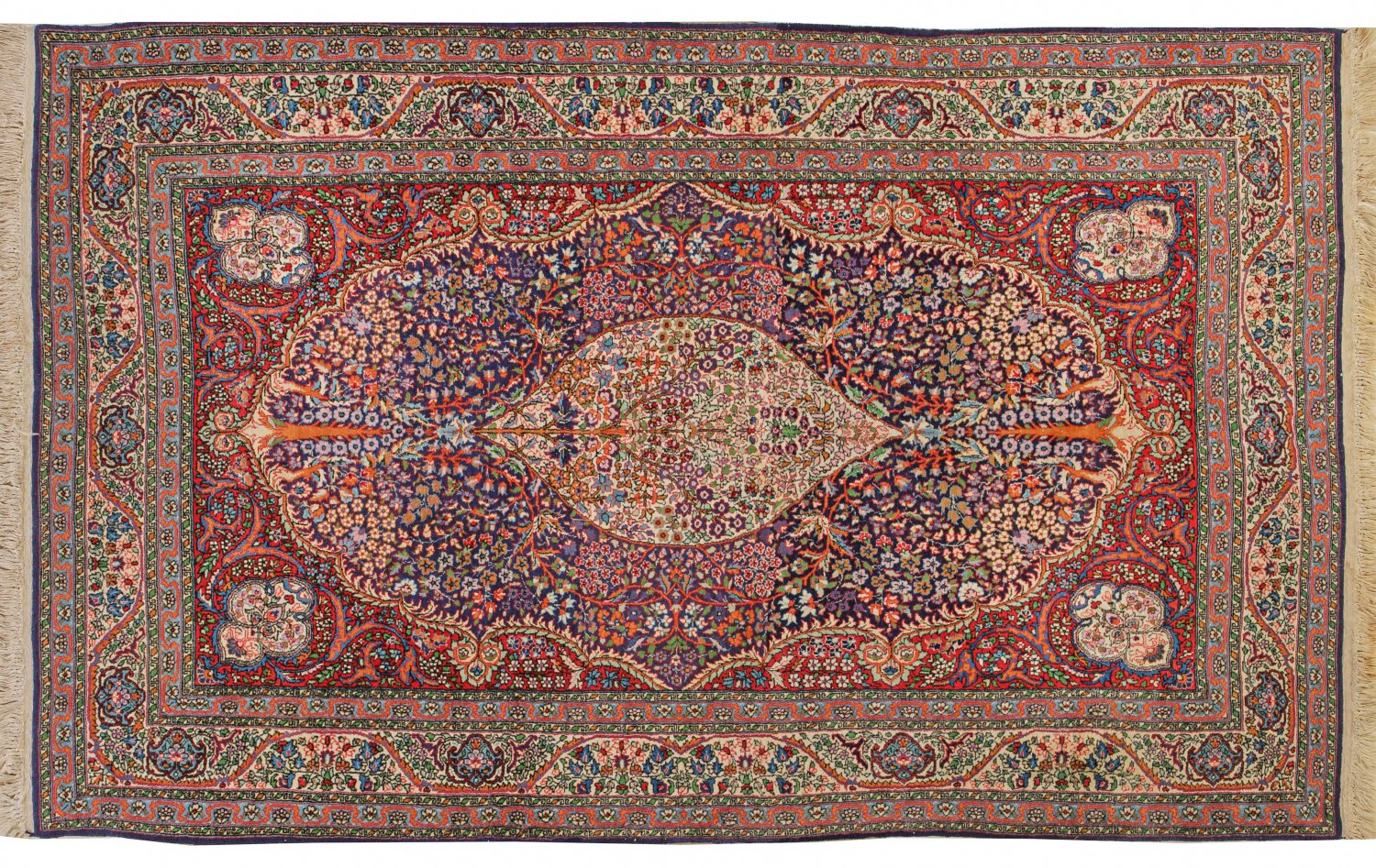 Indien. Wolle auf Baumwolle. Passig geschweiftes, dunkelblaues Innenfeld mit gestrecktem Zentralmedaillon sowie flächendeckender Musterung aus dicht angeordneten Blütenrispen. Korrespondierende Ecklösungen sowie umlaufend elfenbeinfarbene Bordüre aus Blütenranken. 135 cm x 224 cm.