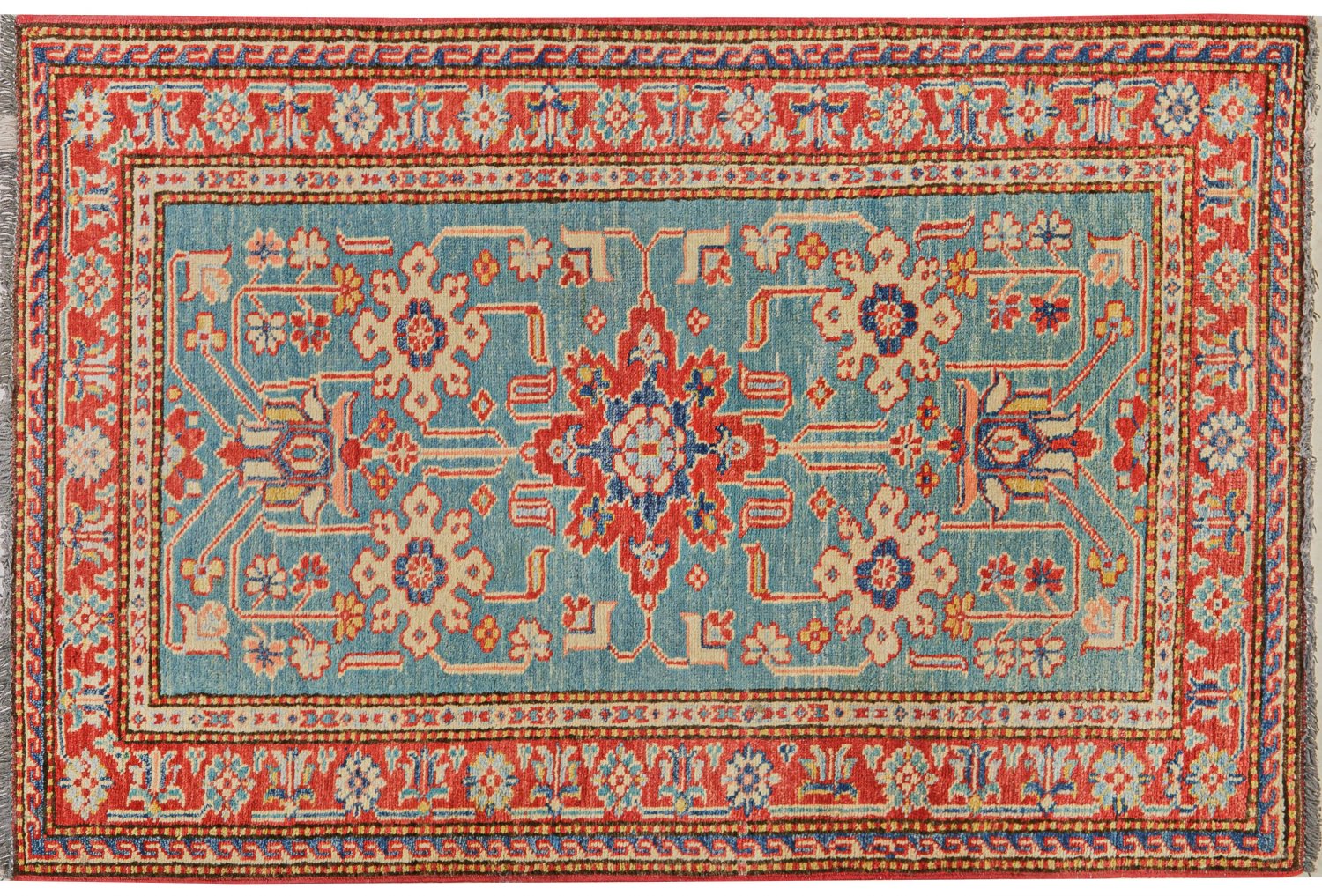 Wolle auf Wolle. Im türkisblauen Innenfeld rotes Zentralmedaillon sowie Musterung aus stilisierten Arabesken. Umlaufend rotgrundige Palmettenbordüre, flankiert von schmalen Borten. 86 cm x 121 cm.