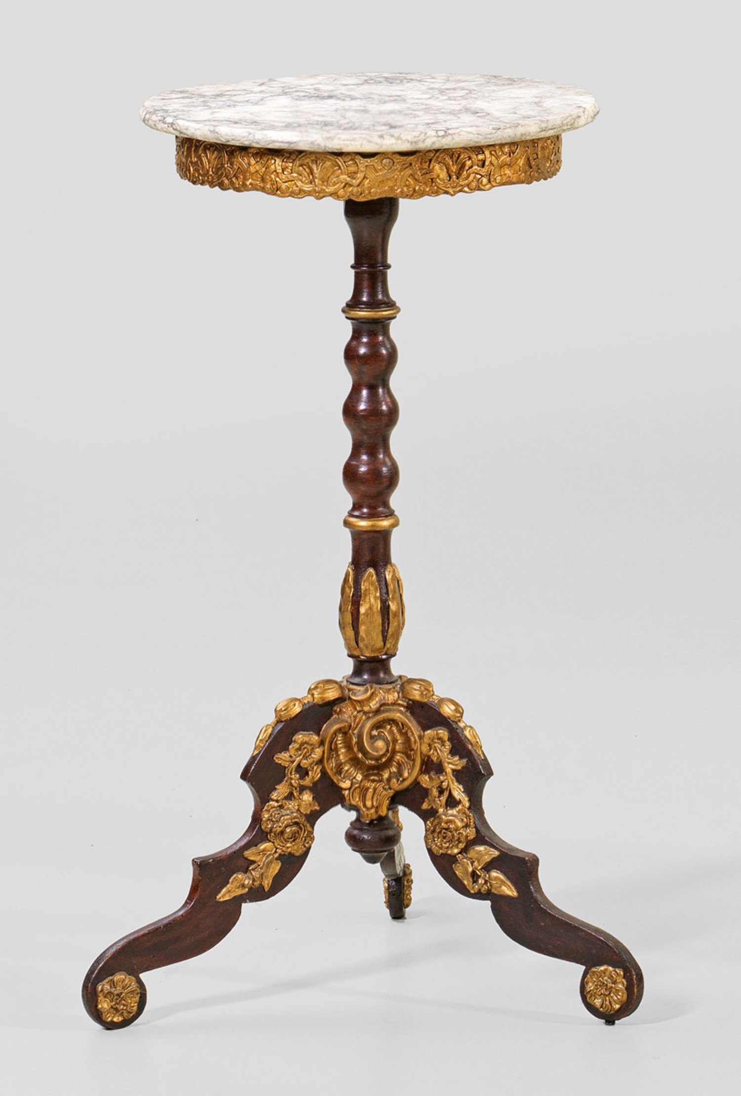 Holz, rotbraun gefasst und Pappmaché, vergoldet. Mehrfach gegliederter Balusterschaft auf stark geschwungenen Volutenbeinen mit reliefiertem Blütendekor als Träger für schmale Zarge aus Bandelwerk sowie runde Deckplatte aus Marmor. H. 75 cm. D. 38 cm.