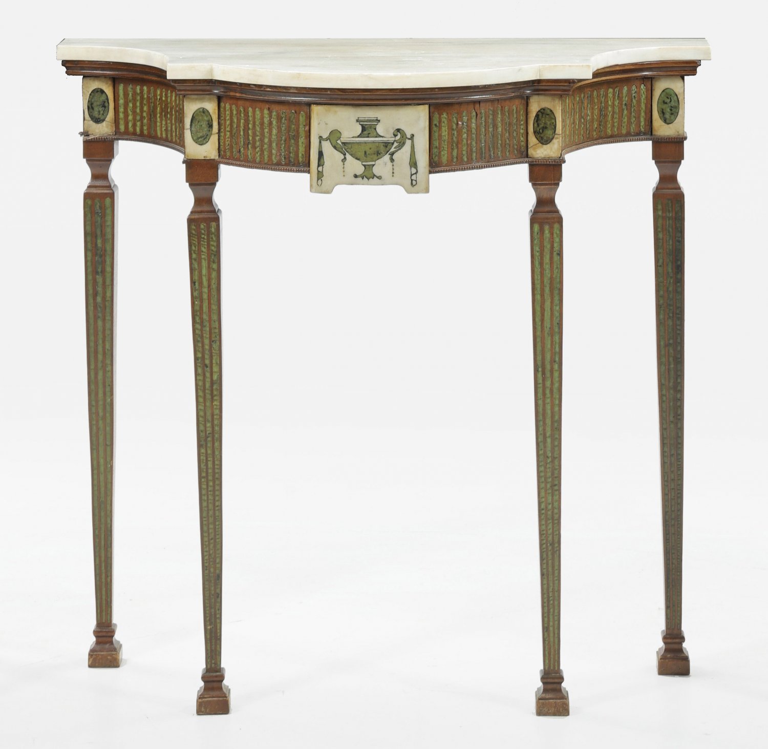 Mahagoni mit Einlagen aus grünem Lack sowie Alabaster und weißer Marmor. Bombierte, zu den Seiten konkav eingezogene Zarge auf hohen, gekanteten Balusterbeinen. In der Mitte Reserve mit Vasenmotiv. Korrespondierende, gering überstehende Deckplatte. H. 84,5 cm. 88,5 cm x 36 cm.