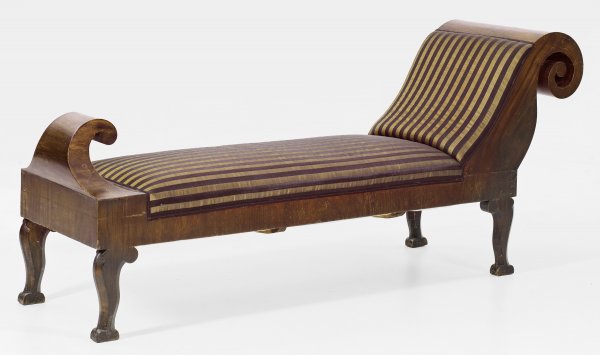 Mahagoni, furniert. Gerade Zarge auf flachen, geschweiften Beinen. Ausschwingende, volutenförmig eingerollte Lehne sowie korrespondierender unterer Abschluss. Gepolstert und mit gestreiftem Rosshaar bezogen. Altersspuren. H. 91 cm. 208 cm x 56,5 cm.