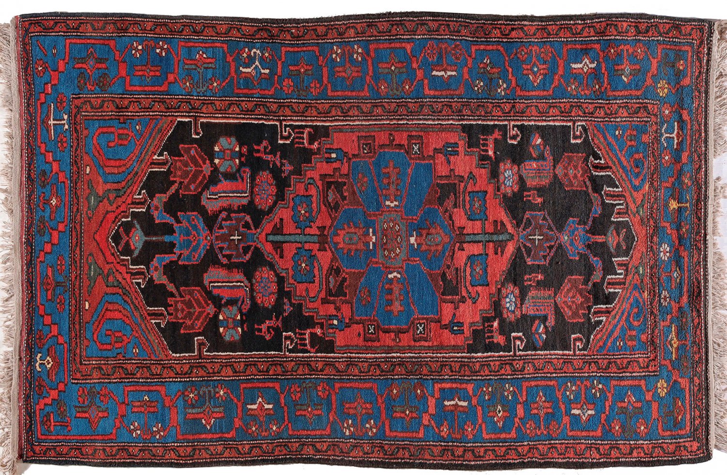 Persien. Hamadan-Gebiet. Mitte 20. Jh.; Wolle auf Baumwolle. Auf schwarzem Grund rotes Rautenfeld mit großem, blauem Blütenmedaillon. Umlaufend breite, blaue Bordüre aus stilisierten Ranken. 150 cm x 240 cm.
