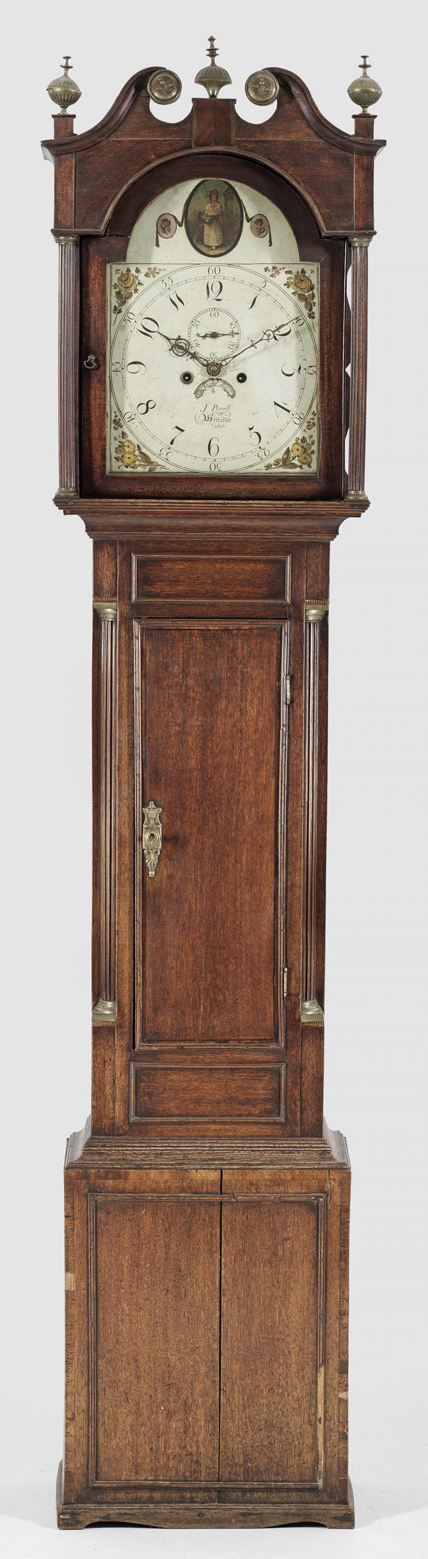 Sog. Grandfather's clock. Eichenholz, mahagonifarben gebeizt. Eintüriger Korpus, flankiert von Viertelsäulen auf gekantetem Sockel. Vorkragender Uhrenkopf mit gesprengtem Giebel. Polychrom gestaltetes Zifferblatt mit kleiner Sekunde, bez. "J. Powell Worchester". Werk mit Ankerhemmung und Schlagwerk auf Glocke. Überholungsbedürftig. H. 230 cm.