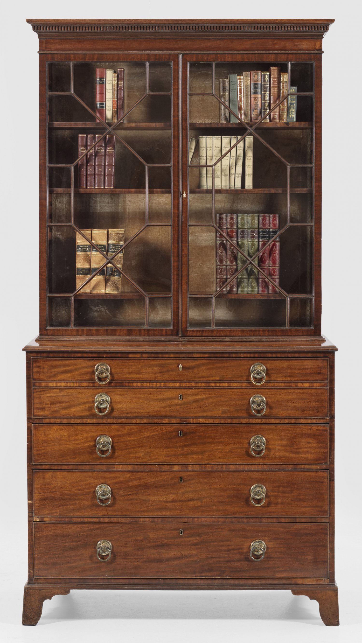 Mahagoni, furniert. Gerader, rechteckiger Korpus auf gesägten Füßen. In der gegliederten Front drei Schubladen unterschiedlicher Größe sowie zwei als Arbeitsfläche abklappbare Blendschubladen mit olivgrüner Ledereinlage. Dahinter gestaffelte Facheinteilung. Zurückgesetzter, zweitürig sprossenverglaster Vitrinenaufsatz mit Zahnfries. H. 229 cm. 117 cm x 56,5 cm.