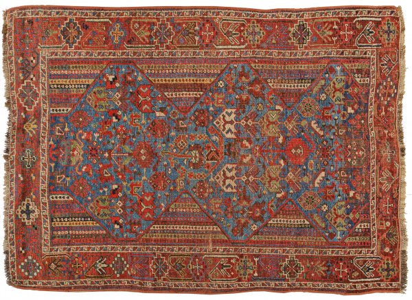 Persien. 1. Hälfte 20. Jh.; Wolle auf Wolle. Auf flächendeckend gestreiftem Fond große, blaugrundige Reserve mit dichter Ornament-Musterung aus Rosetten und Murgi in Grün- und Rottönen. Umlaufend breite, korrespondierende Reserve. 113 cm x 158 cm.