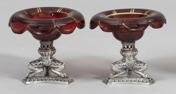 A pair of German Biedermeier silver and glass salieres. Age-related signs of use, glass dented.