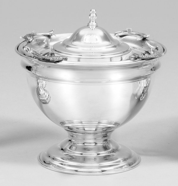 Silber. Über getrepptem Stand halbrunder Korpus mit glatter Wandung. Einsatz am Rand mit vier plastisch gearbeiteten Fischen verziert, mittig farblose Glasschale. Glockenförmiger Deckel mit kleinem Balusterknauf. Minim. best.; Gest. 925. Gew. ca. 655 g. H. 18 cm.