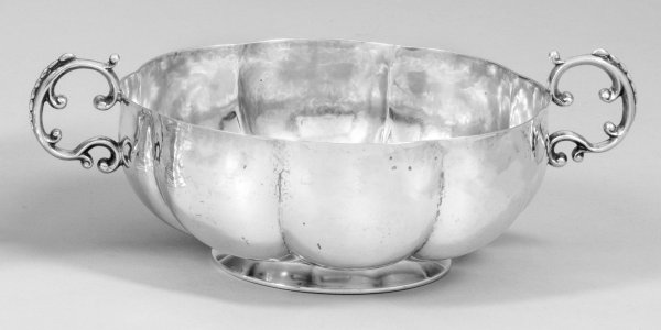 Silber. Runder, kurzer Stand, übergehend in weit ausschwingende Schale mit zart blütenförmig geschwungenem Rand. Seitlich zwei volutierte Henkel. Die Wandung umzogen von ausgeprägtem, achtfachem Buckeldekor und verziert mit Hammerschlagdekor. Gest. Stadtmarke, Jahresmarke "L 8", Herstellerzeichen. Gew. ca. 470 g. H. 8,5 cm. D. 16,5 cm.