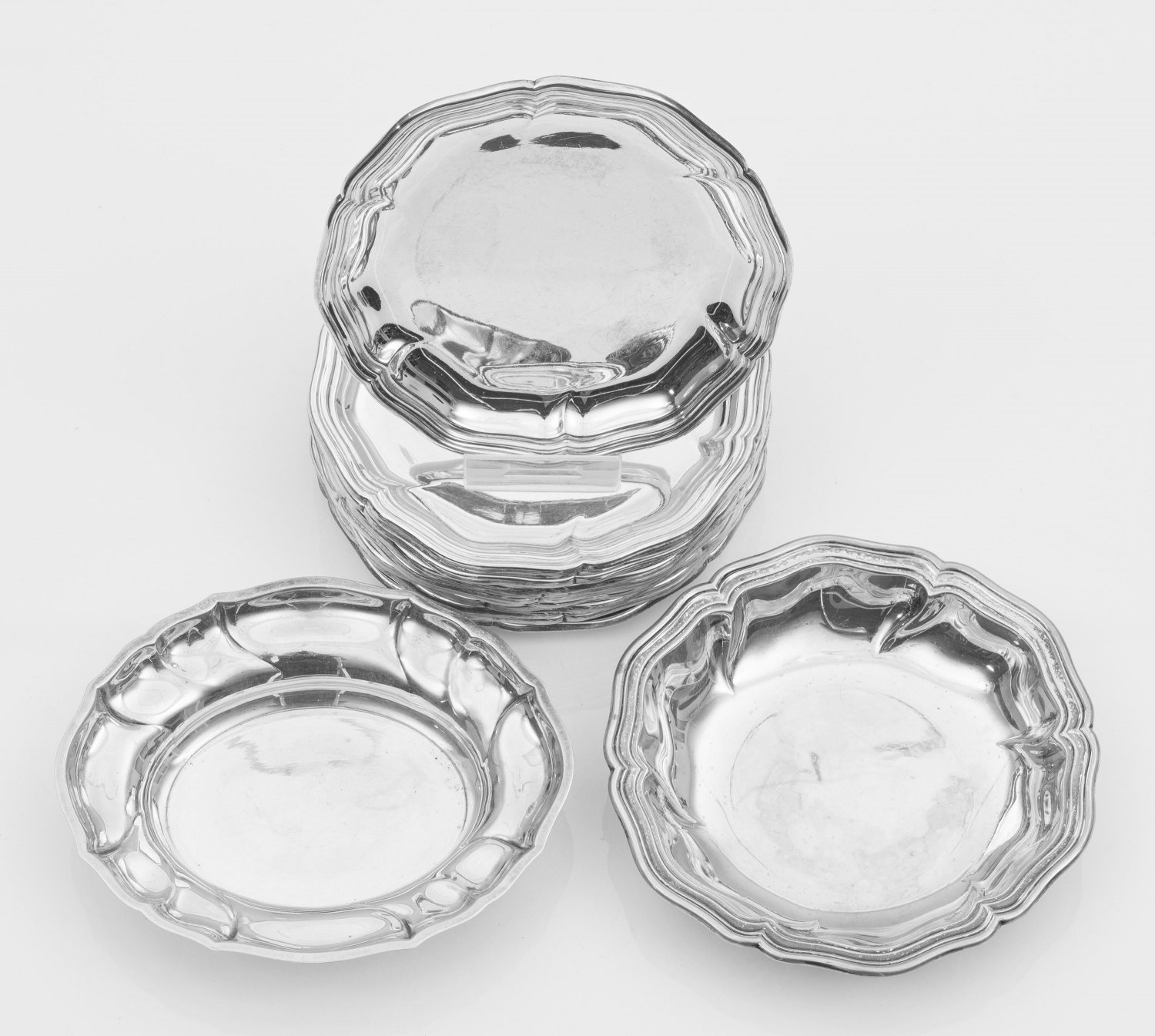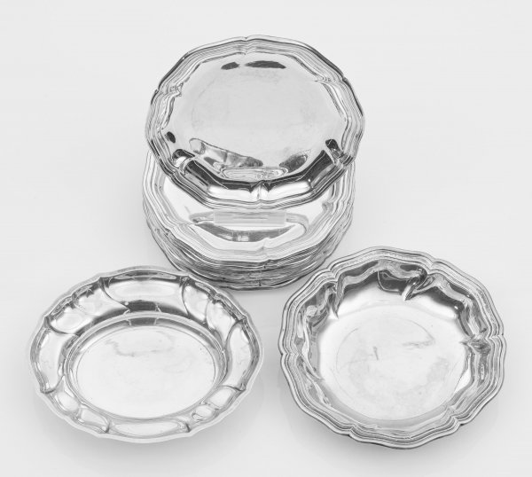 Silber. 14-tlg.; 12 Glas-, 1 Flaschenuntersetzer, kleine ovale Anbietschale, in klassischer Chippendaleform. Gering vertiefter, glatter Spiegel, übergehend in breite Fahne. Blütenförmig geschweifter, mehrfach profilierter Rand. Gest. 800, 835, Herstellerzeichen. Gew. zus. ca. 965 g. D. 12 cm - 13 cm.