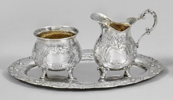 Creamer, sugar bowl and tray. Gilt inside. Standard mark 835, maker´s mark.