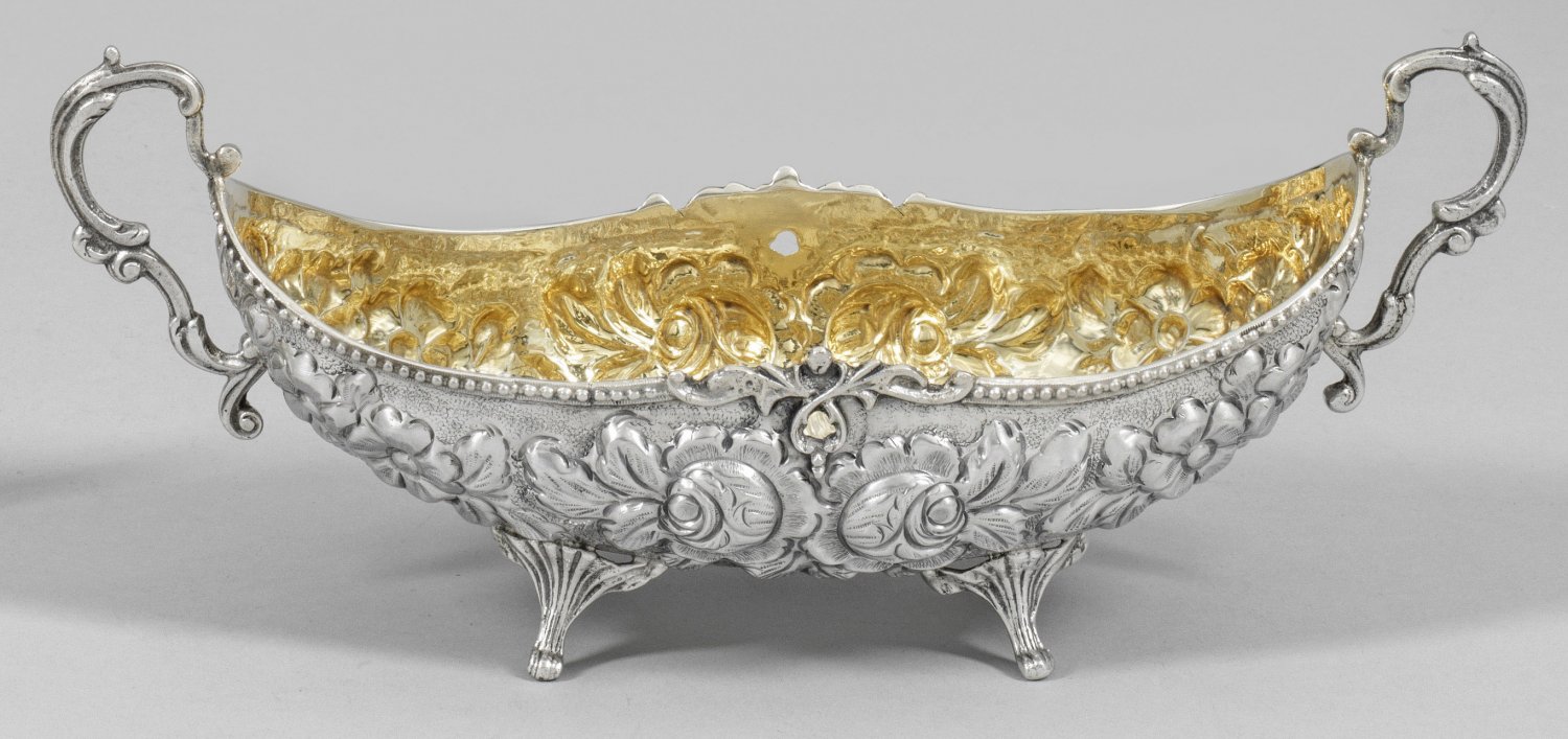 Silber. Schiffchenförmiger Korpus mit reliefplastischem Blütendekor und Volutenhenkel. Innen vergoldet. Gest. 925. Gew. ca. 315 g. 27,5 cm x 10 cm.