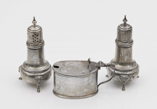 3-tlg.; Salz- und Pfefferstreuer, Senfgefäß mit kobaltblauem Glaseinsatz. Über drei Füßen in Form von stilisierten Widderköpfen ein bauchiger, konisch spitz zulaufender Korpus. Das Senfgefäß mit kleinem Bandhenkel und scharniertem Deckel. Glaseinsatz minim. best.; Gest., u. a. Sterling, Herstellerzeichen. Gew. zus. ca. 225 g.