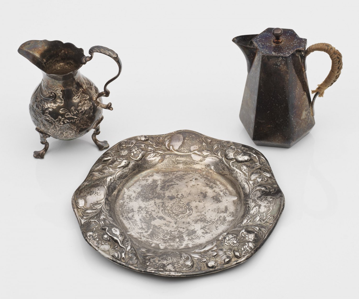 Two creamers and a small monogrammed and dated serving plate. Different assay and maker´s marks. Date letters.