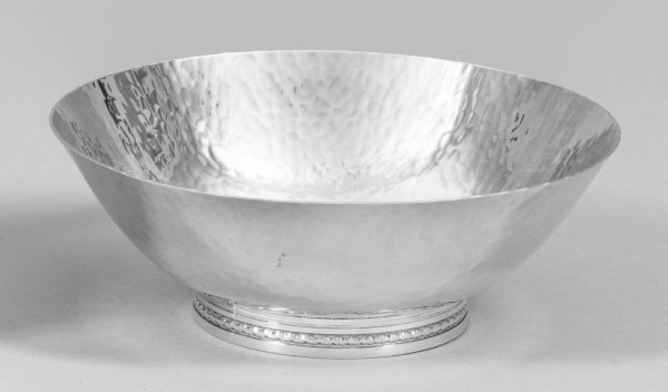 Silber. Zylindrischer, mit Wellenband verzierter Sockel, übergehend in weit ausschwingende, tief gemuldete Schale. Fächendeckender Hammerschlagdekor. Entw. Erich Löfman. Auf der Unterseite zerkratzte und unkenntlich gemachte Gravur. Minim. Gebrauchsspuren. Gest. 830, Stadtmarke, Jahresmarke "U10", Herstellerzeichen. Gew. ca. 280 g. D. 16 cm.