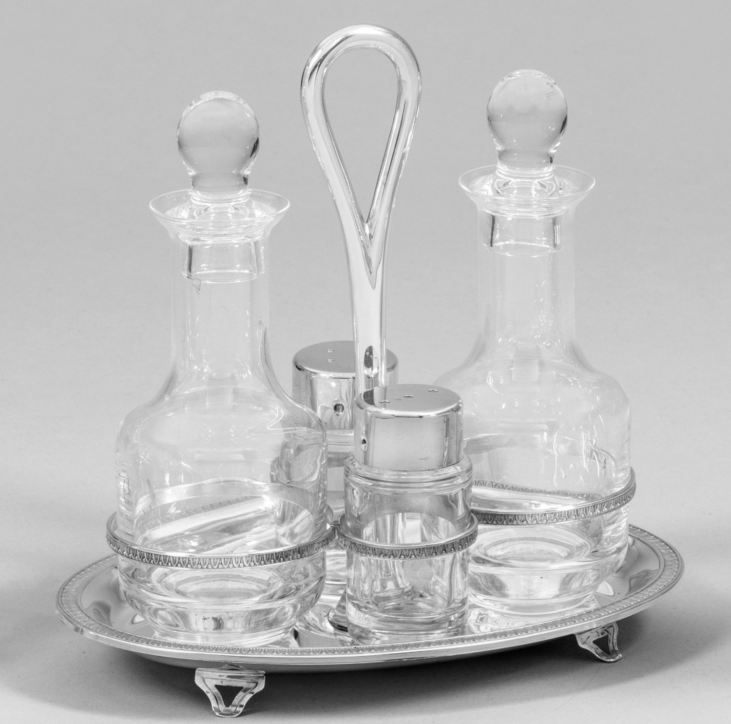 Silber. 5-tlg.; Ovaler Stand mit ausgestelltem, von Blattfries umzogenem Rand und mittig aufsteigender, ovaler Griff. Unterhalb vier korrespondierende, mit Blattdekor verzierte Halteringe für Essig- und Ölflasche sowie Pfeffer- und Salzstreuer aus farblosem Glas, teilw. mit Silbermontierung. Gest. 925 bzw. 800, Herstellerzeichen. H. 21 cm.
