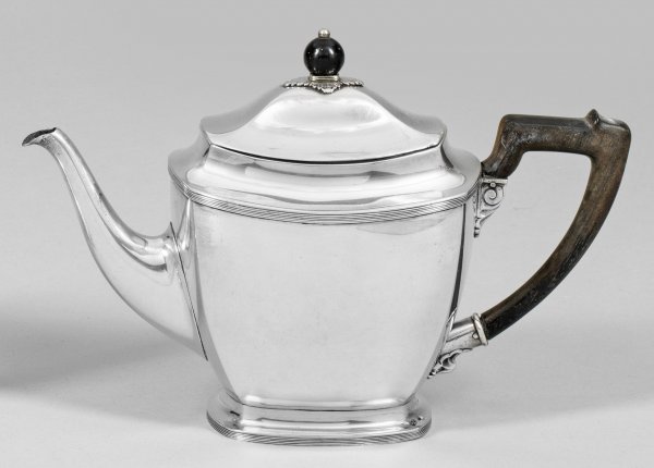 Silber. Von gering eingezogenem, rechteckigem Standring getragener, vierkantig ansteigender Korpus mit glatter Wandung und profilierter Schulter. Facettierter, gewölbter Deckel und geschwungener, konischer Röhrenausguss. Kugelknauf und kantiger Henkel aus ebonisiertem Holz, am Ansatz mit reliefplastischem Muschelwerk verziert. Gest., Herstellerzeichen, Exportmarke, Steuermarke. Gew. ca. 420 g. H. 16,5 cm.