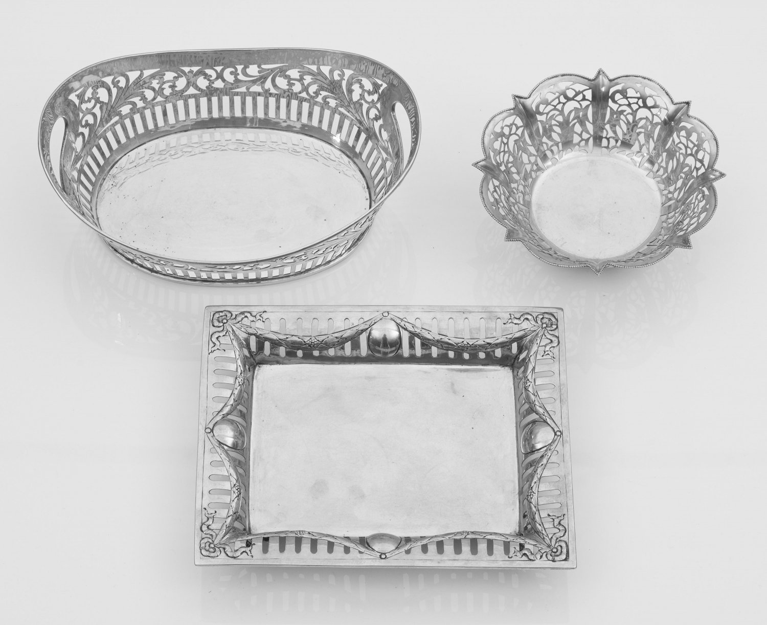 Silber. Brotkorb, Fußschale und Salver mit durchbrochen gearbeiteter Wandung. Gest. 800 und 925. Gew. zus. ca. 370 g. B. 15 cm - 22,5 cm.