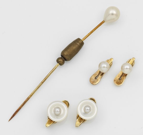 Gelbgold, gest. 585. Zwei Paar Frackknöpfe sowie Plastron-Nadel mit weißen Perlen besetzt. Originale Etuis. Ges.-Gew. ca. 7,22 g.