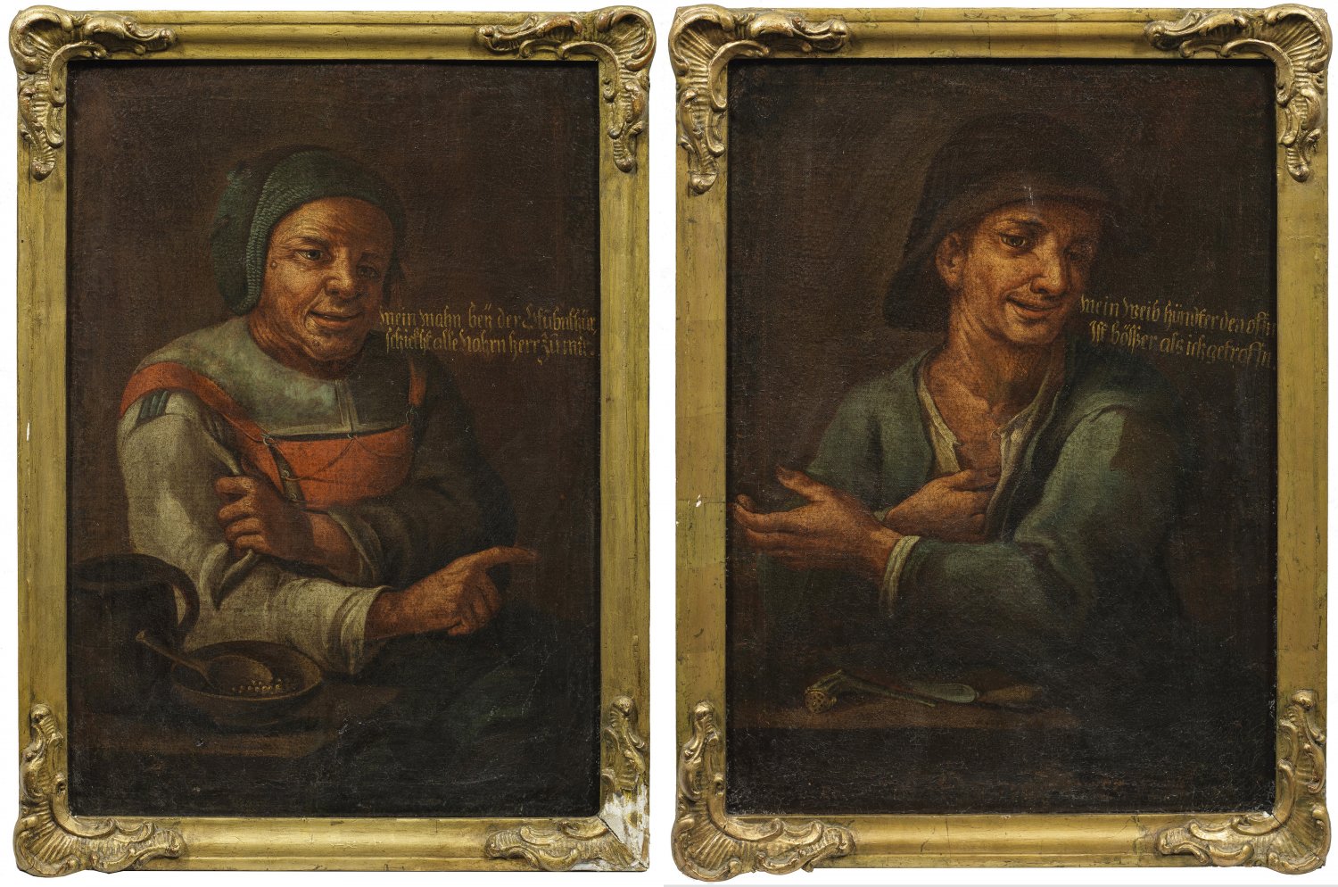 Gegenstücke. Gemäldepaar, auf amüsante Weise eine weibliche Vorherrschaft in einer barocken Landwirtschaft darstellend. Öl/Lwd.; Männerporträt o. r. minim. besch.; Ca. 67 cm x 49 cm. Wohl Original-Rahmen.