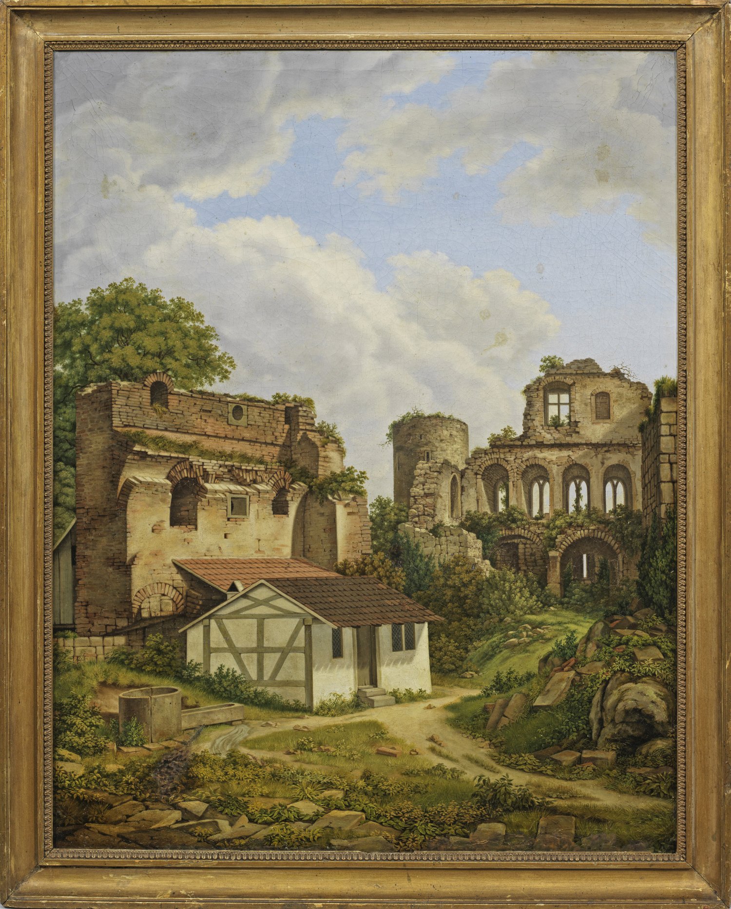 Fein und detailreich gemalte, lichtreiche Ruinenvedute des autodidaktischen Landschafts- und Architekturmalers Freiherr Roeder von Diersburg, den eine lebenslange Freundschaft mit den Konstanzer Malern Joseph Mosbrugger, Franz Xaver von Riedmüller und Marie Ellenrieder verband. Öl/Lwd.; Minim. besch./rest.; 88 cm x 71,5 cm, Rahmen.