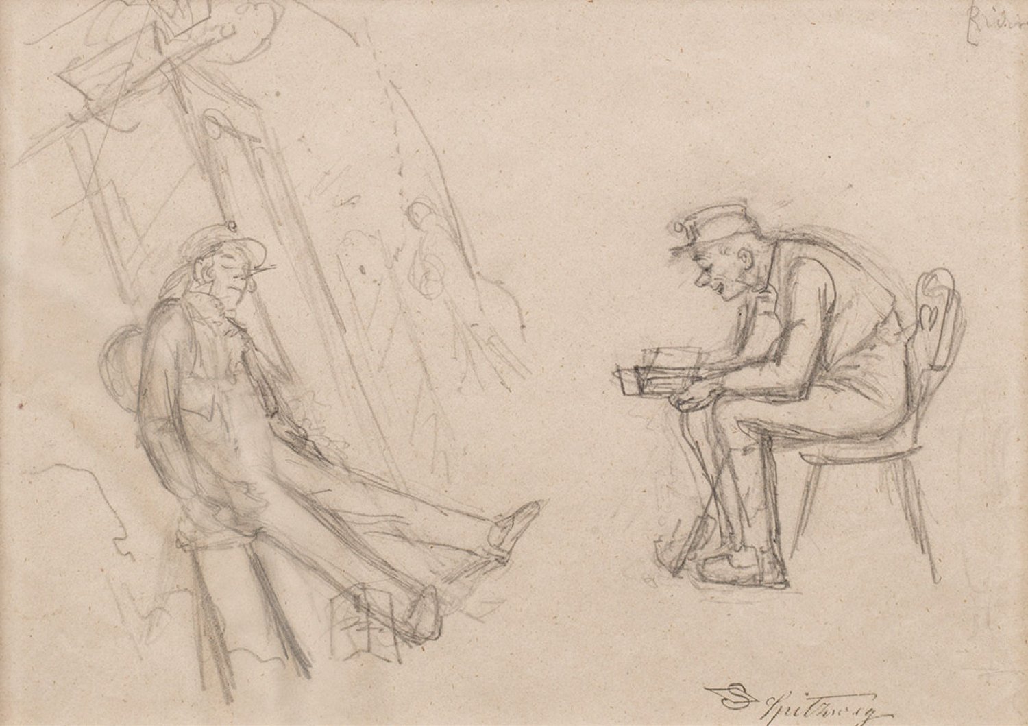 Skizzenblatt mit leicht diagonaler, szenischer Interieurdarstellung eines sitzenden, schlafenden jungen Mannes auf einem Brettstuhl; gegenüber ein ebenfalls auf einem Brettstuhl sitzender, tief über ein Buch gebeugter Mann. Das stille, poetische Motiv Schlafender und Lesender hat Spitzweg in einer Reihe von Gemälden geschildert. Bleistift/Papier. R. u. Nachlass-Stempel. Blatt 22,8 cm x 28,3 cm. Rahmen.
