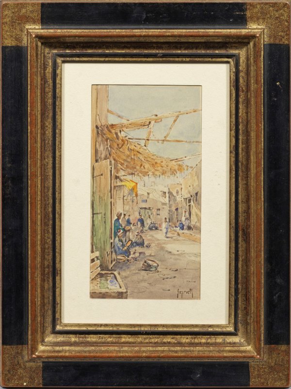 Für den in Triest und Rom ausgebildeten griechischen Künstler charakteristische Straßenszene, der durch seine fast ausschließlich in Aquarell ausgeführten, atmosphärisch gestimmten, lichtdurchfluteten Landschaften, Veduten und Marinebilder bekannt wurde. Mit Vorliebe schilderte Scarvelli Motive aus Ägypten, Italien und Griechenland. Seine Werke befinden sich in bedeutenden privaten und öffentlichen Sammlungen wie der Nationalgalerie in Athen. Aquarell/Papier. R. u. sign.; 33 cm x 22 cm. Aufwändig gestalteter Studio-Rahmen.