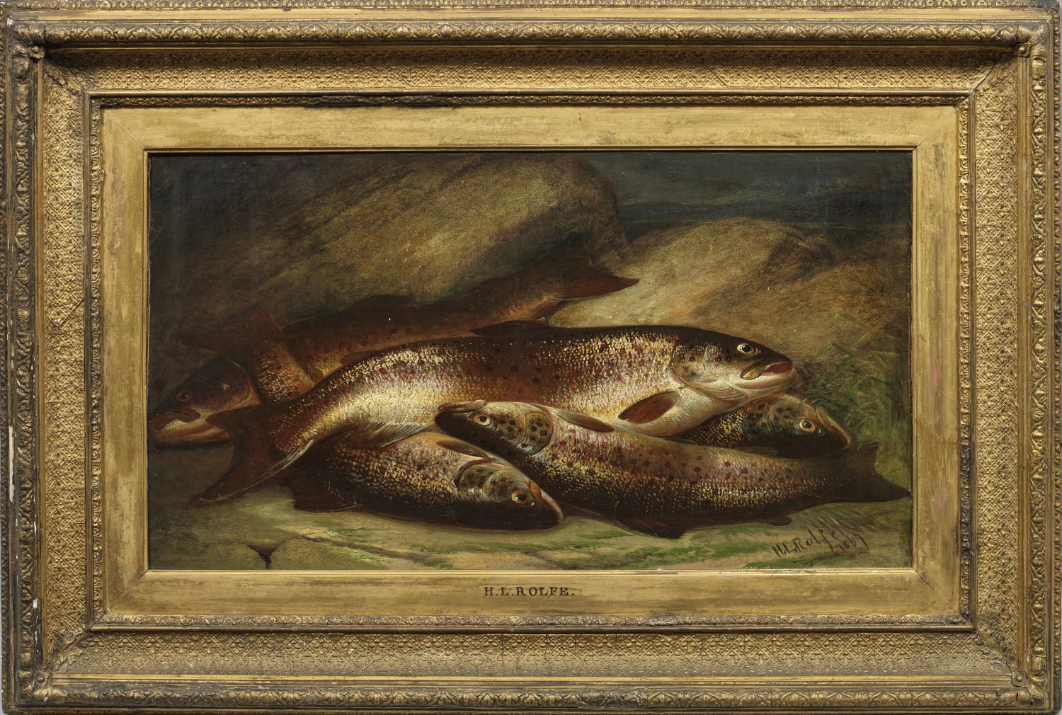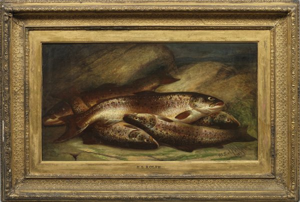 Rolfe, der 1847 - 1874 in der Royal Academy ausstellte, schilderte meist Stillleben mit Fischen und Angelgeräten, die er in Landschaften oder an Flussufern darstellte. Öl/Lwd., doubl.; R. u. sign. u. dat. 1867. Verso auf originalem Etikett bez. u. undeutl. betitelt. 31,5 cm x 56 cm. Original-Rahmen.