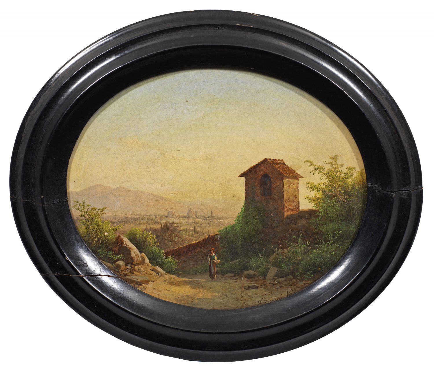 In ein Oval komponierte, weichmalerische Abendstimmung mit Blick auf die Stadt Florenz, eine für den Künstler charakteristische Landschaftsvedute mit einer jungen, den Weg entlangschlendernden Italienerin im Vordergrund und einem Wachturm auf der rechten Seite. Öl/Holz. Sign. und dat. 1872. 18 cm x 22,5 cm. Rahmen.
