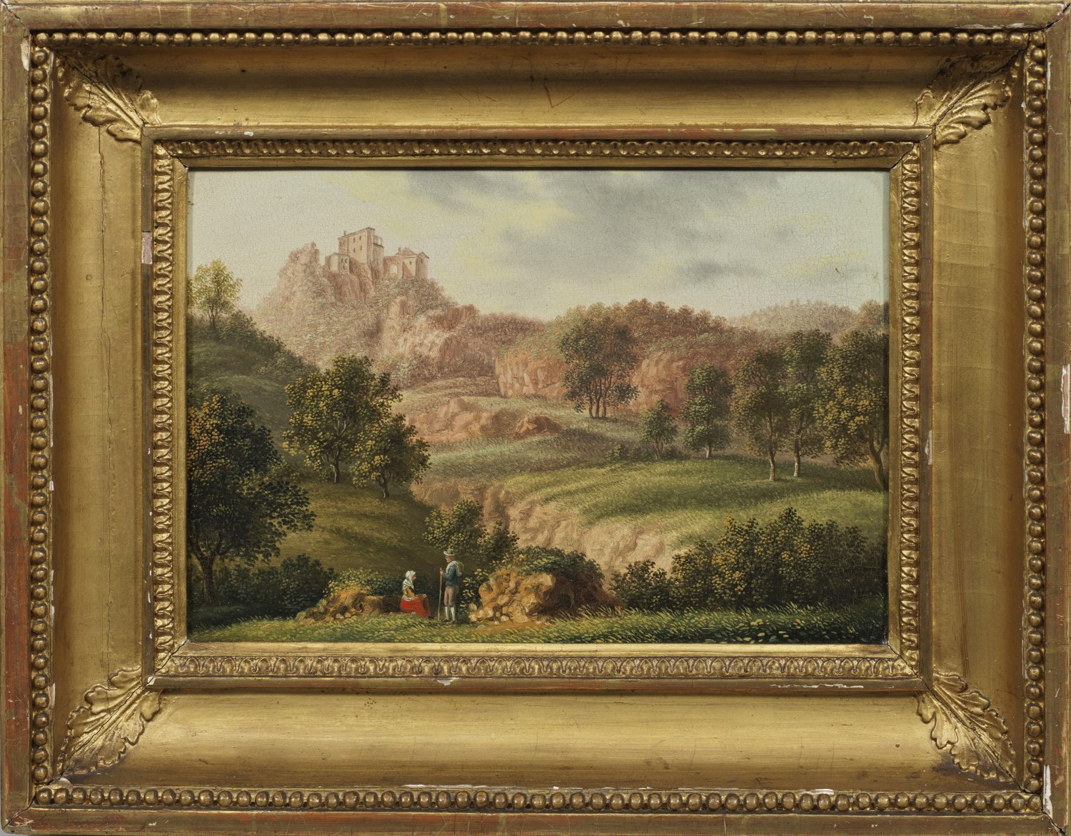 Stimmungsvolles Gemälde mit einer Burg auf einer Anhöhe vor einem sommerlich warmen Himmel. Im Vordergrund ein sich ausruhendes Wandererpaar am Waldesrand. Öl/Holztafel. 16,5 cm x 24 cm. Original-Rahmen.