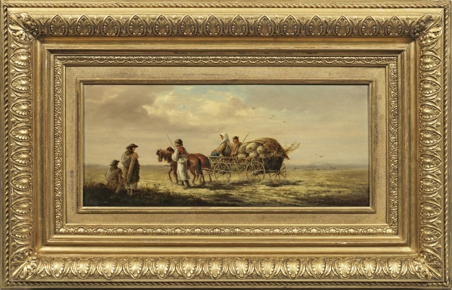 Fein gemaltes, stimmungsvolles Kabinettbild des auf Landschaften sowie auf Reiter- und Pferdemotive aus Ungarn spezialisierten Künstlers. Wolfram nahm 1860 - 1873 an Ausstellungen des Österreichischen Kunstvereins teil. Öl/Lwd.; L. u. sign. u. dat. 1873. 21 cm x 47 cm. Wohl Original-Rahmen.