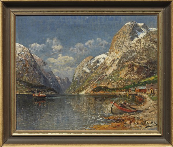 Impressionistische, motiv- und stiltypische Fjordlandschaft des norwegischen Malers. Holmstedt wuchs am Hardangerfjord auf und verbrachte die Sommermonate später regelmäßig in Balestrand am Sognefjord, wo er die Motive für seine Landschaftsgemälde fand. Öl/Lwd.; L. u. sign.; 42 cm x 53 cm. Rahmen.