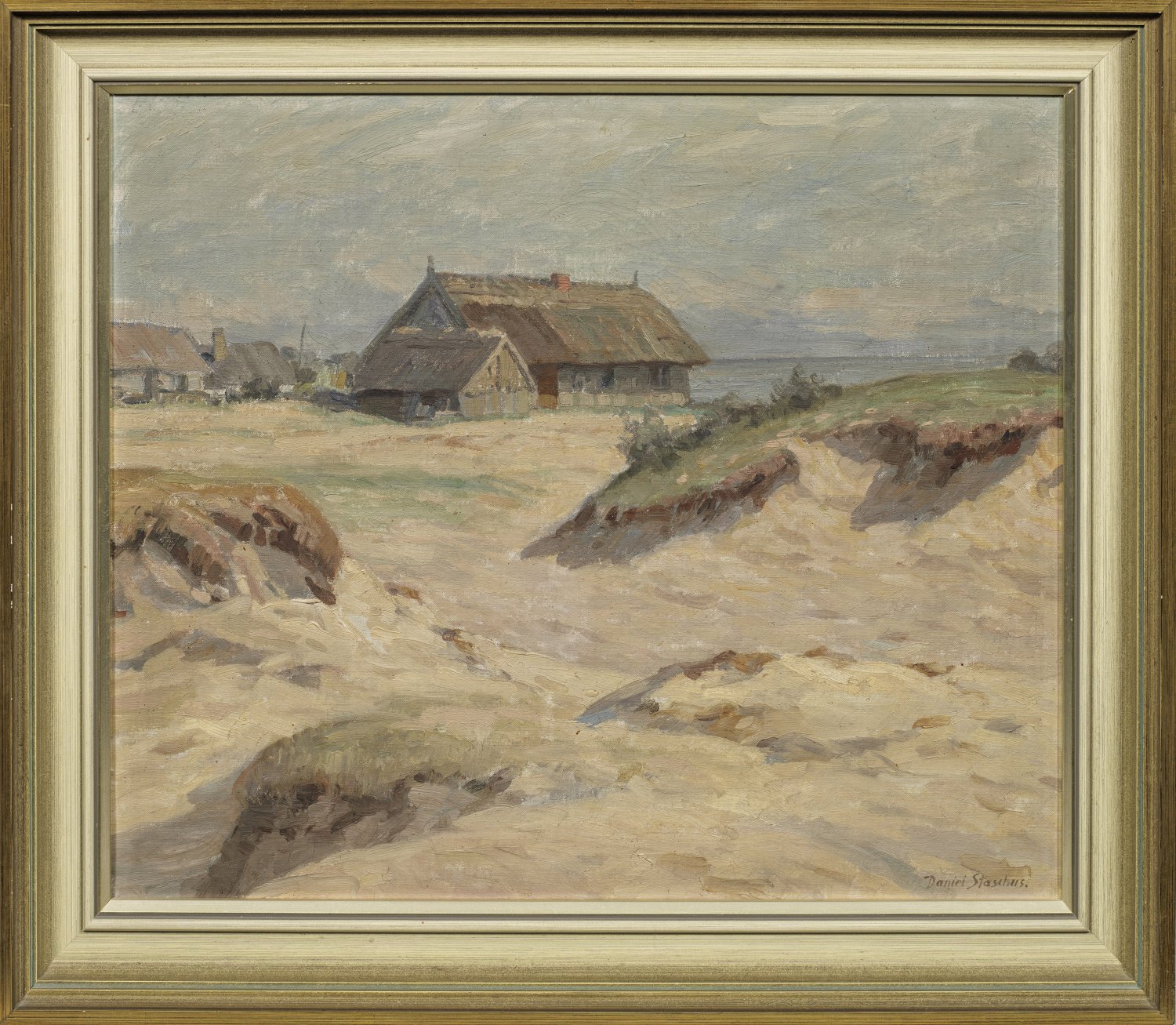 Blick in Richtung Ostsee. Spätimpressionistisches Werk des Malers und Grafikers. Der 1887 - 1894 an der Königsberger Akademie ausgebildete Maler und Grafiker reiste öfters in das idyllische Fischerdorf Nidden, das als Künstlerkolonie Max Pechstein, Karl Schmidt-Rottluff und Theo von Brockhusen anzog, überdies Literaten wie Thomas Mann, der dort ein Sommerhaus hatte. Öl/Lwd.; R. u. sign.; 55 cm x 65 cm Rahmen.