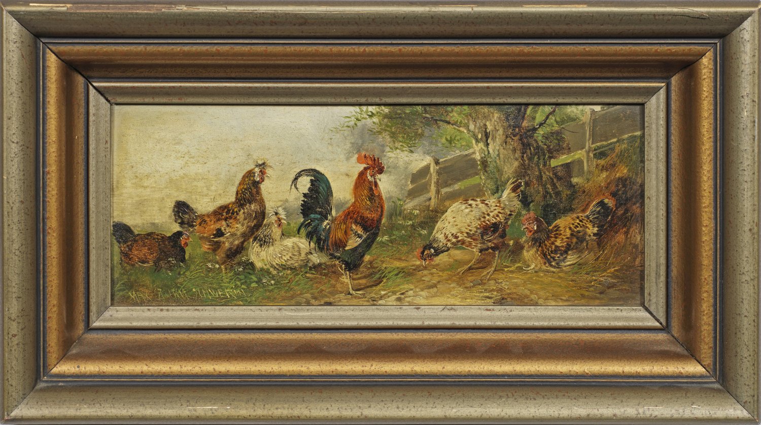 Ein Hahn mit fünf Hennen an einer Eiche. Öl/Holz, L. u. sign. und ortsbezeichnet Schwerin. 10 cm x 27 cm. Rahmen.