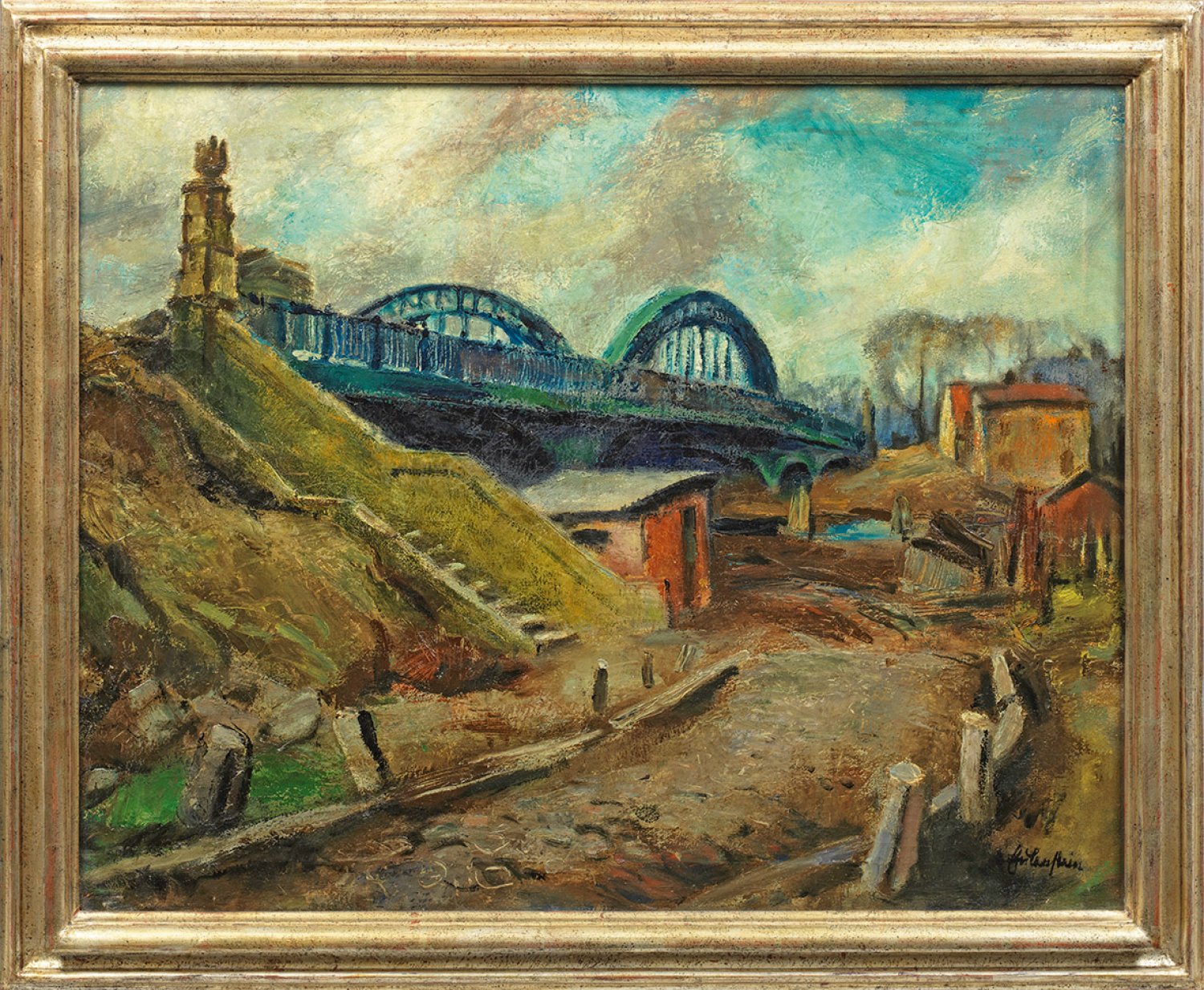 Wohl vor 1945 entstandene, expressiv-realistische Landschaft Wellensteins, der 1918 - 1924 an der Lehranstalt des Berliner Kunstgewerbemuseums mit Hannah Höch, Karl Hubbuch und Georg Grosz bei Emil Orlik studierte. Im Rückblick ist Wellensteins Oeuvre in Zusammenhang mit Werken von Karl Hofer, Hans Grundig, Edgar Ende, Heinz Trökes und Walter Tiemann zu sehen. Mit seinen Großstadt-, Zirkus- und Maskenbildern sowie Landschaften der 1930er/40er Jahre spiegelte er die existenziellen Unsicherheiten des Individuums wider. Öl/Lwd.; R. u. sign.; 64 cm x 82,5 cm. Rahmen.