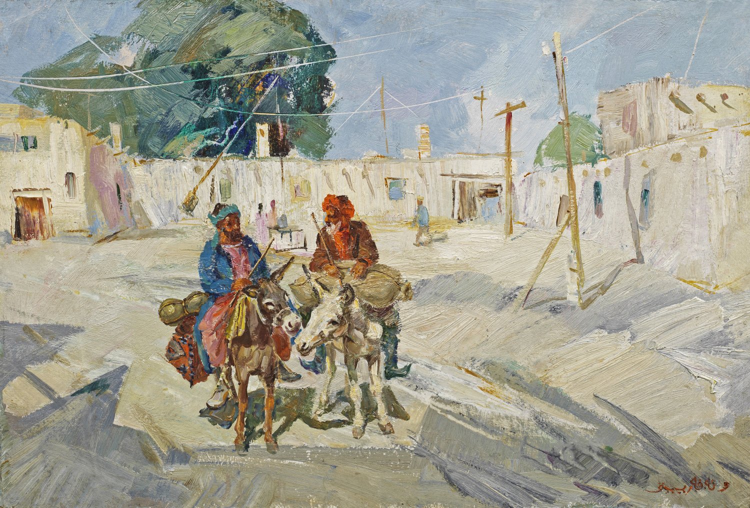 Lichtdurchflutete, mit schnellem, breitem Duktus gemalte Darstellung, bei der sich der Künstler auf die beiden leuchtend farbig gewandeten, miteinander redenden Figuren und die zwei einander zugewandten Esel konzentrierte. Motiv und Stil lassen eine Entstehung in einer der zentralasiatischen Republiken in der südlichen UdSSR annehmen. Öl/Malkarton. R. u. Arabisch sign.; 47,5 cm x 70 cm.