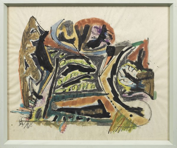 Der Künstler studierte an der Berliner Kunstakademie, erhielt 1951 den Kunstpreis der Stadt Berlin und war als Mitglied des Deutschen Künstlerbundes bis in die 1980er Jahre vielfach auf dessen Ausstellungen vertreten. Mischtechnik/Papier. L. u. monogr. u. dat. 1958. 70 cm x 85 cm. Künstler-Rahmen.