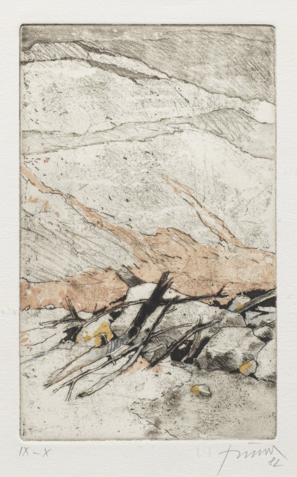 Two sheets with pencil and watercolour drawing and hand-coloured etching. Each signed and dated 1978 or 1982, the drawing with title and dedication, the etching numbered IX - X.