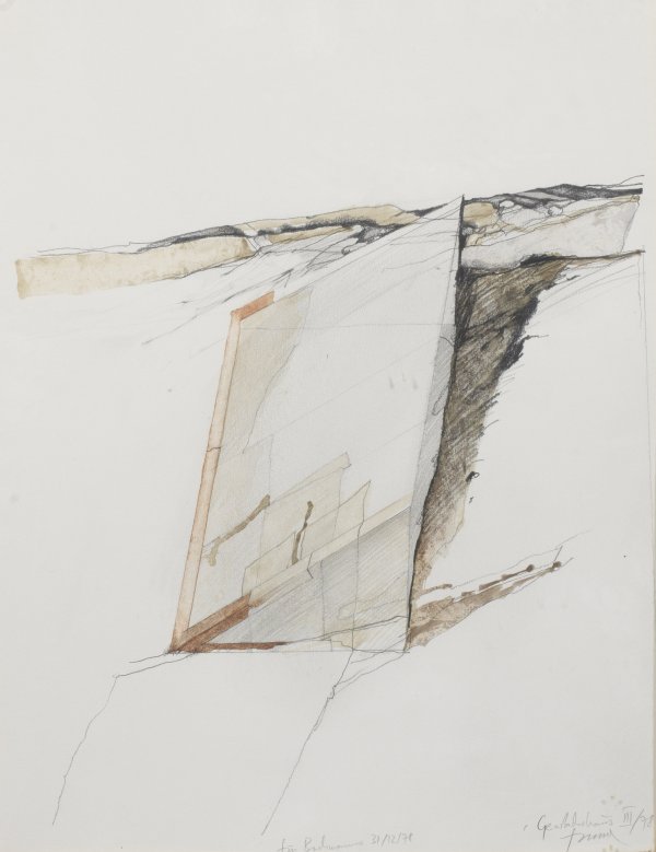 Zwei Blätter mit Aquarell-Bleistiftzeichnung "Gewächshaus III/78" (Originaltitel) und aquarellierter Radierung