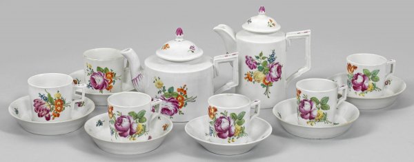 8-tlg.; Mokka-, Teekanne und sechs Tassen mit Untertassen. Blumendekor in polychromer Malerei. Teilw. best./rep./Haarriss. Teilw. Manufakturmarke. Kannen-H. 13,5 cm - 18,5 cm.