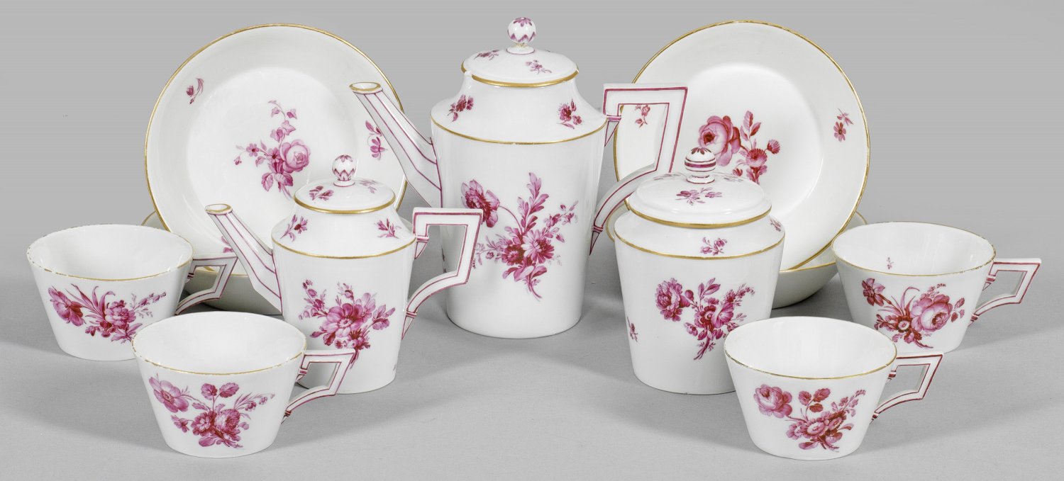 7-tlg.: Kaffeekanne, Zuckerdose, Sahnegießer, 4 Tassen mit Untertassen. Feiner Blumendekor in purpurfarbener Camaieumalerei. Teilw. best./rest.; Zeptermarke. Kannen-H. 15,5 cm.