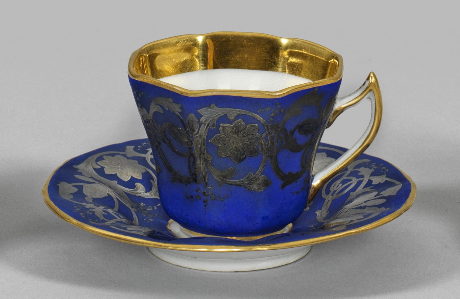 A blue ground porcelain cup and saucer with floral silver decor. Foot minor chipped. Manufacturer's mark.