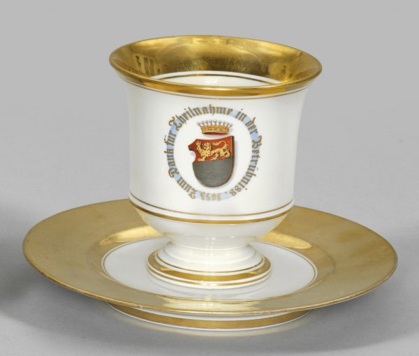 auf Untertasse. Vom getrepptem Rundfuß abgesetzter Korpus, seitlicher Volutenhenkel. Schauseitig bekröntes Adelswappen in Silber-Rot mit Löwen als Wappentier mit Widmungsumschrift "Zum Dank für Teilnahme in der Betrübniss. 1853" in polychromer Malerei. Reiche Vergoldung. Untertasse abweichend. Eingepresste Manufakturmarke. H. 9,5 cm.