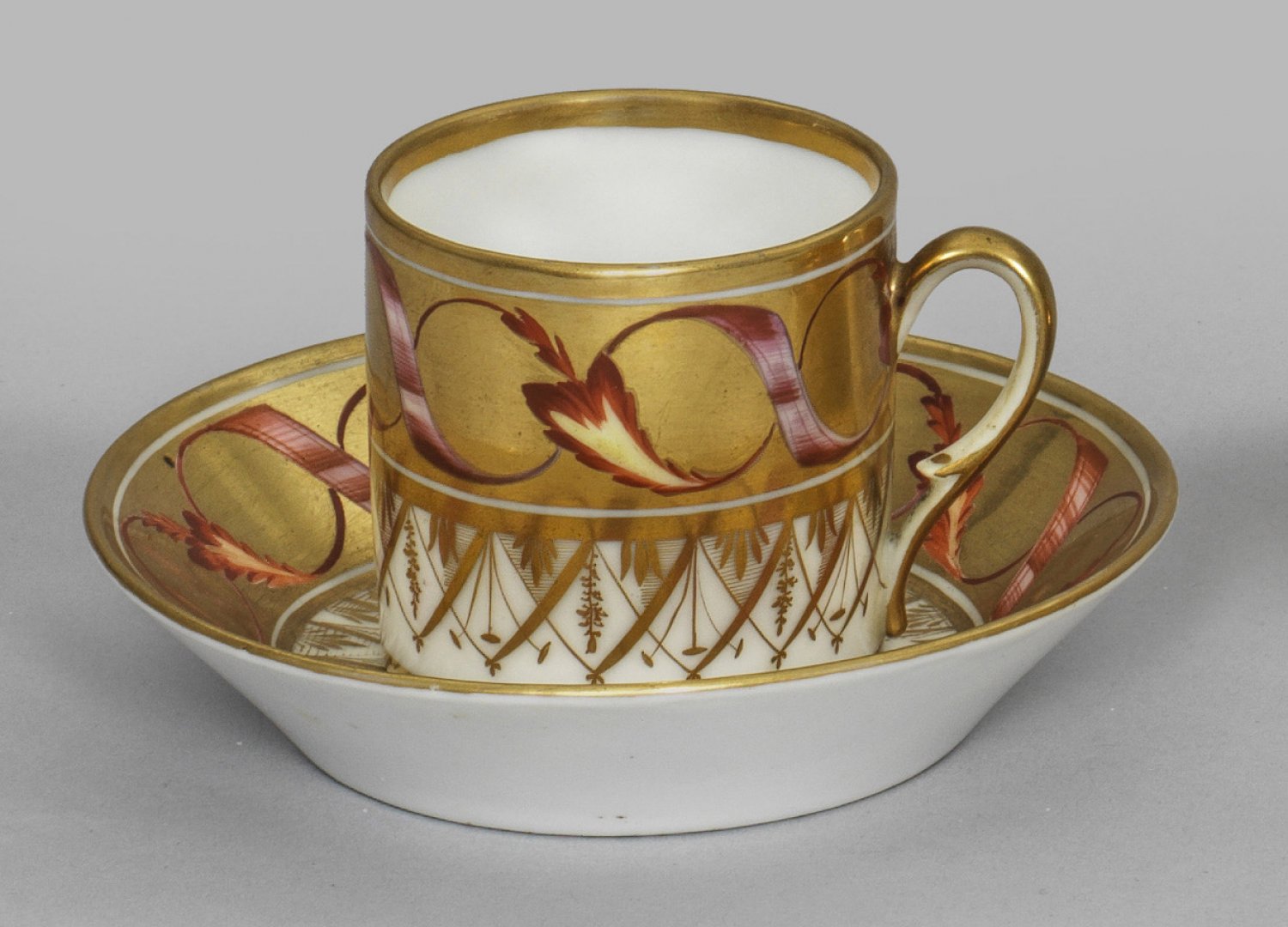 An early 19th C. French porcelain cup and saucer with rich polychrome and gold decoration.