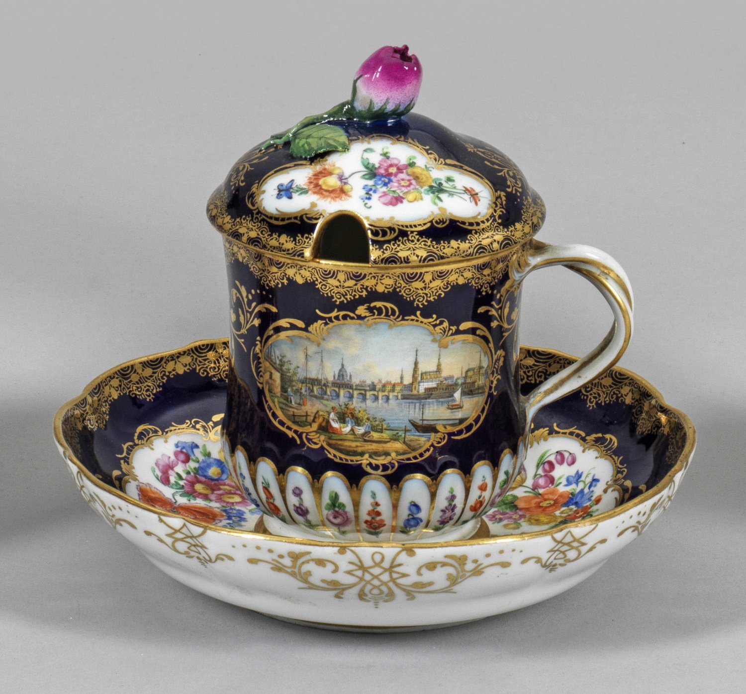 und Deckel auf Unterschale. Bauchiger, unterhalb godronierter und sich nach oben leicht einziehender Korpus. Seitlich gewundener Asthenkel. Gewölbter Deckel mit Einbuchtung für Löffel, mittig plastisch aufgelegter Rosenzweig als Knauf. Beidseitig der Wandung und im Spiegel in kobaltblauem Fond ausgesparte, von Ranken umzogene Vierpassreserven. Darin Stadtvedute von Dresden mit Blick auf die Augustusbrücke, die Frauenkirche und das Residenzschloss bzw. farbenfrohe Blumenarrangements. Godronen mit Blütenzweigen auf weißem Fond. Polychrome Malerei mit reichem Golddekor aus stilisiertem Rankenwerk, Rosette und umlaufender Spitzenbordüre. Deckel rest.; Schwertermarke. H. 14,5 cm.