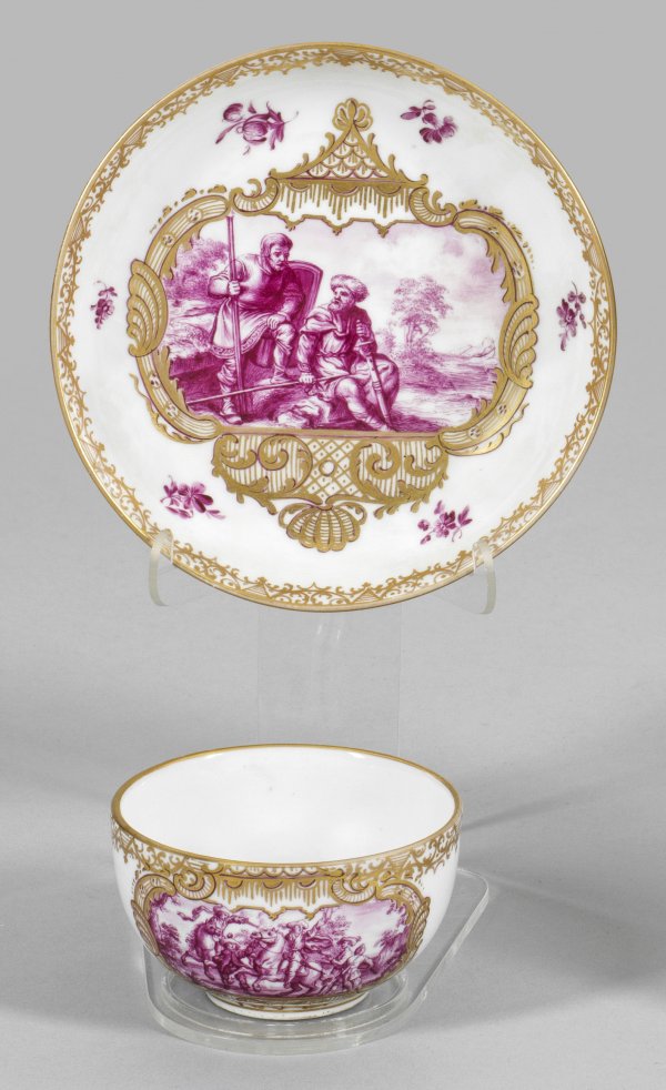 auf Unterschale. Halbkugelig mit Ohrenhenkel. Schauseitig und im Spiegel breite Goldreserve aus Rocaille- und Gitterwerk, darin Reiter im Duell bzw. sitzende Männer im Gespräch. Umgebende Streublumen. Purpurfarbene Camaieumalerei mit Goldornamentbordüre. Schwertermarke. H. 4,5 cm.